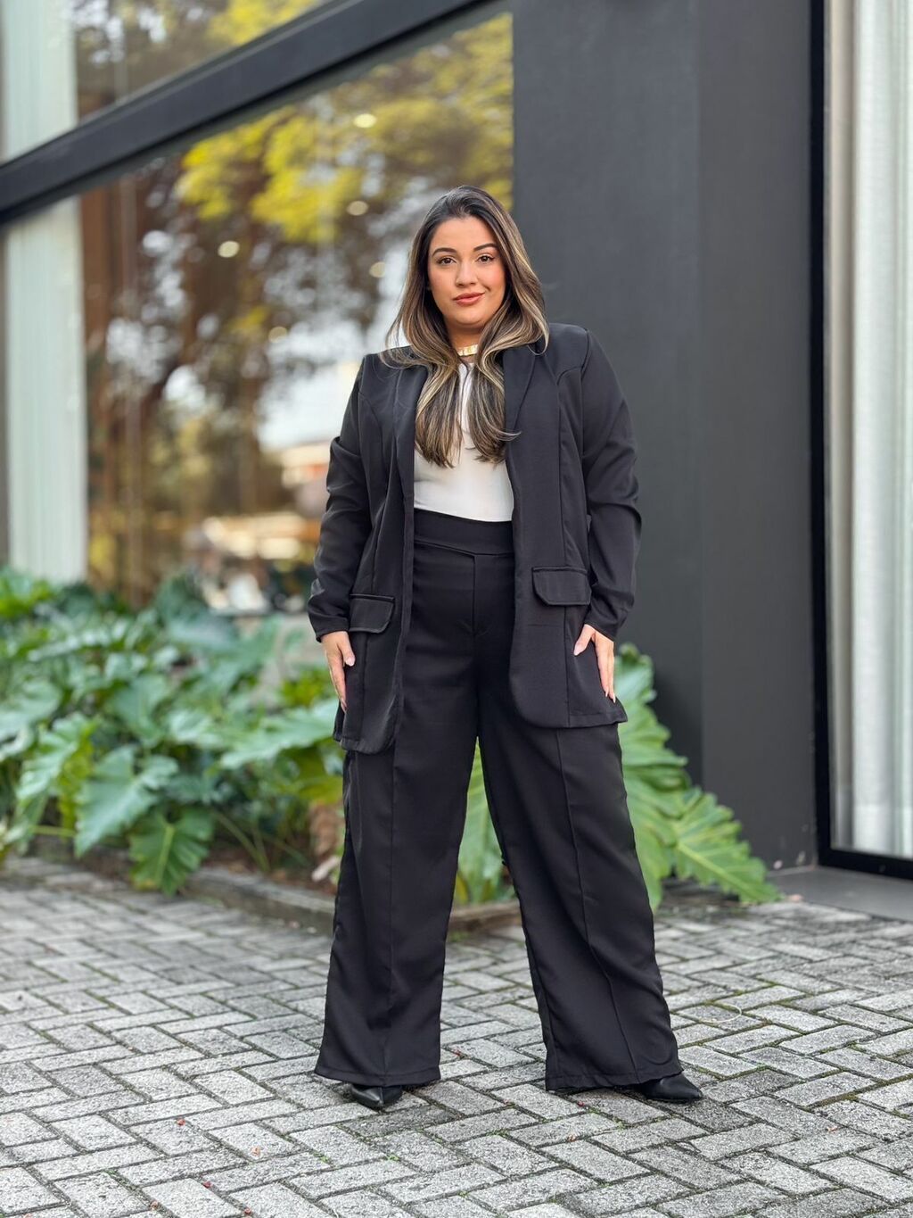 O look ideal para mulheres poderosas e elegantes! Este conjunto plus size de blazer e calça é confeccionado em tecido de alfaiataria premium, oferecendo caimento impecável e conforto durante todo o dia.